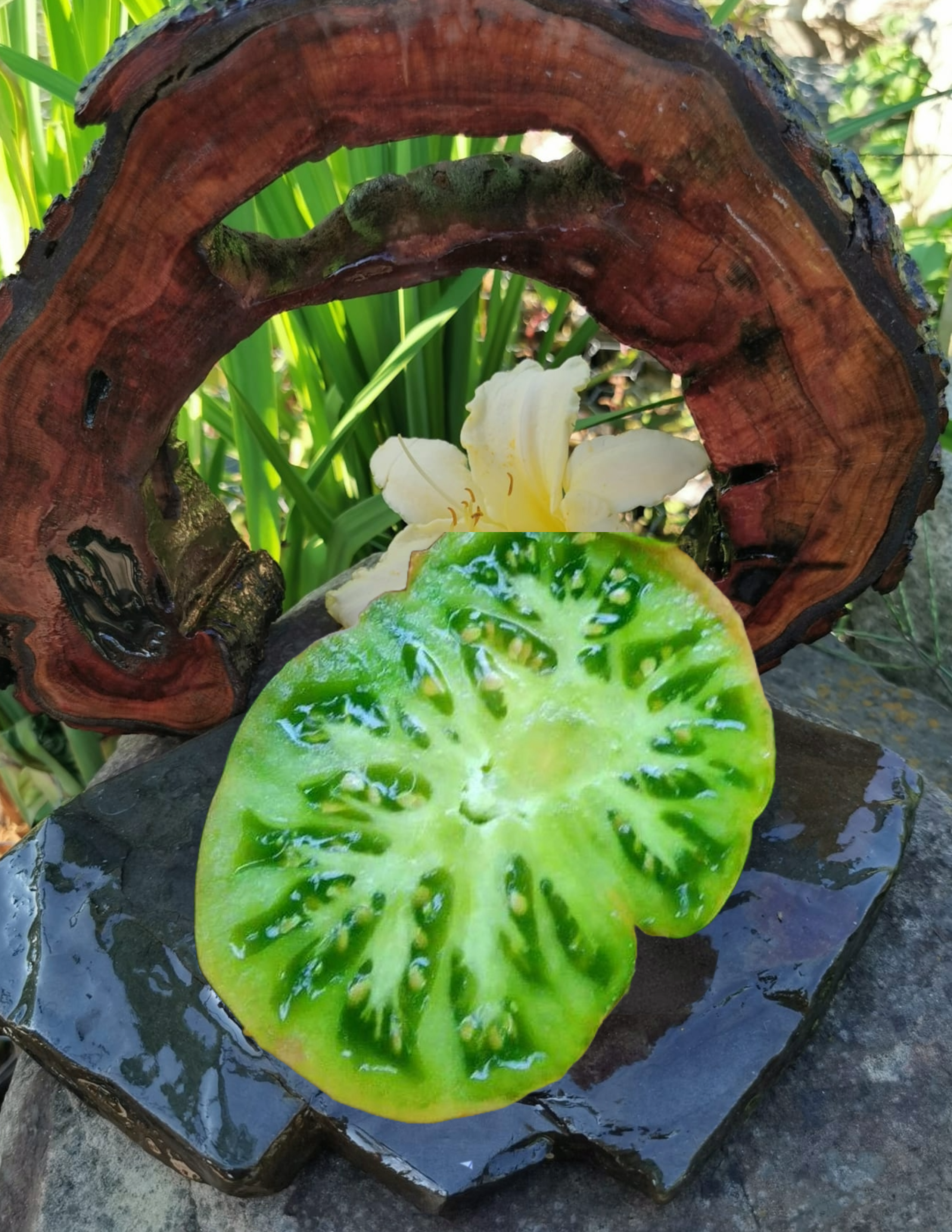 Kolor/ Kształt: Owoce o pięknej, cienkiej, zielonej skórce. Skórka całkowicie dojrzałego pomidora przybiera musztardowy odcień. Miąższ równie smaczny, jak piękny kolorystycznie. Stanowi kompozycję idealną pomiędzy słodyczą i kwaskowością. Wyczuwalne są również nuty cytrusowe i kiwi.