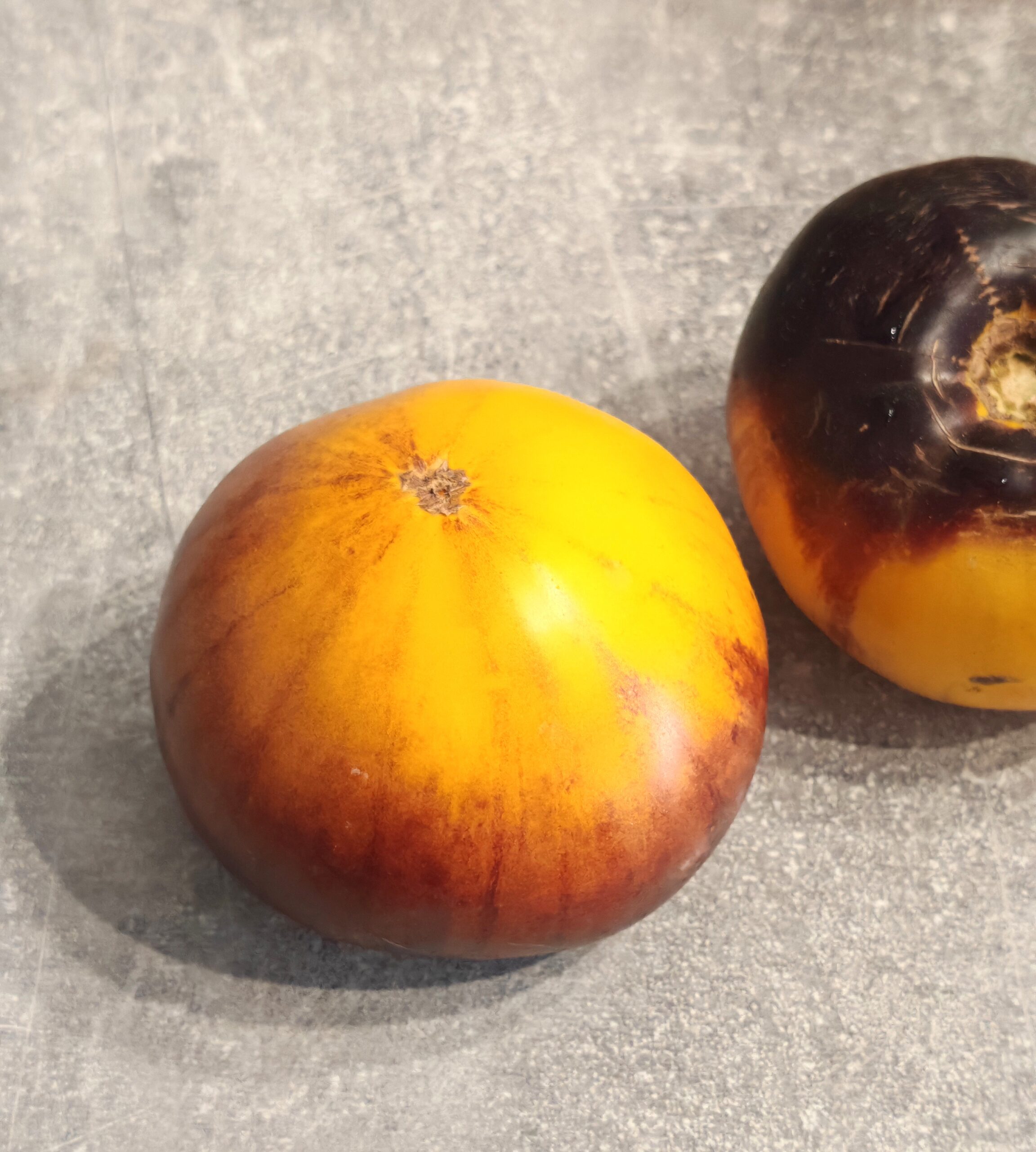 Kolor/ Kształt: Owoce są spłaszczone, typu befsztyk. Pomidory mają żółty kolor z plamami antocyjanowego błękitu indygo, prawie czarne ramiona. Mięsisty i soczysty miąższ.