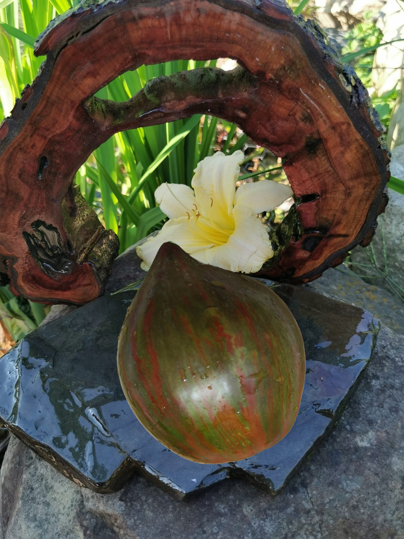 Kolor/ Kształt: Bardzo ładne czerwono-brązowo-zielono-pomarańczowe paski, z miąższem czerwono-brązowym z zielonym, intensywnie pomidorowo-owocowym. Owoce są zaokrąglone do sercowatych. Miąższ wołowy ciemnoczerwony, gęsty i mięsisty, ciemnozielony żel. Doskonały smak.