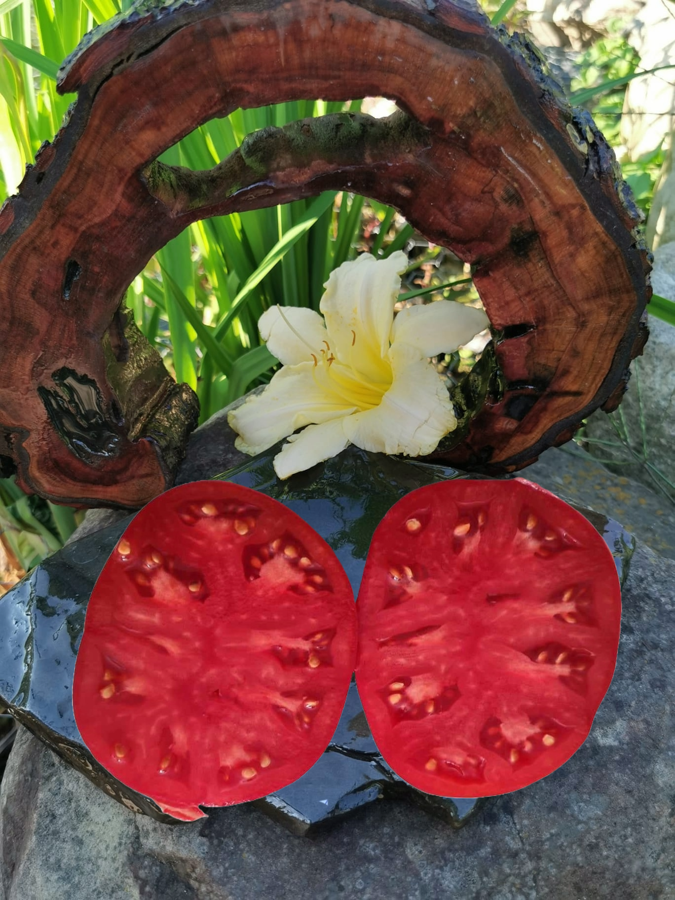 Kolor/ Kształt: Owoce okrągłe o intensywnie różowym kolorze skórki, Miąższ typu befsztyk, niezwykle bogaty, o intensywnym smaku, soczysty i mięsisty. Przypomina smak pomidorów z dzieciństwa.