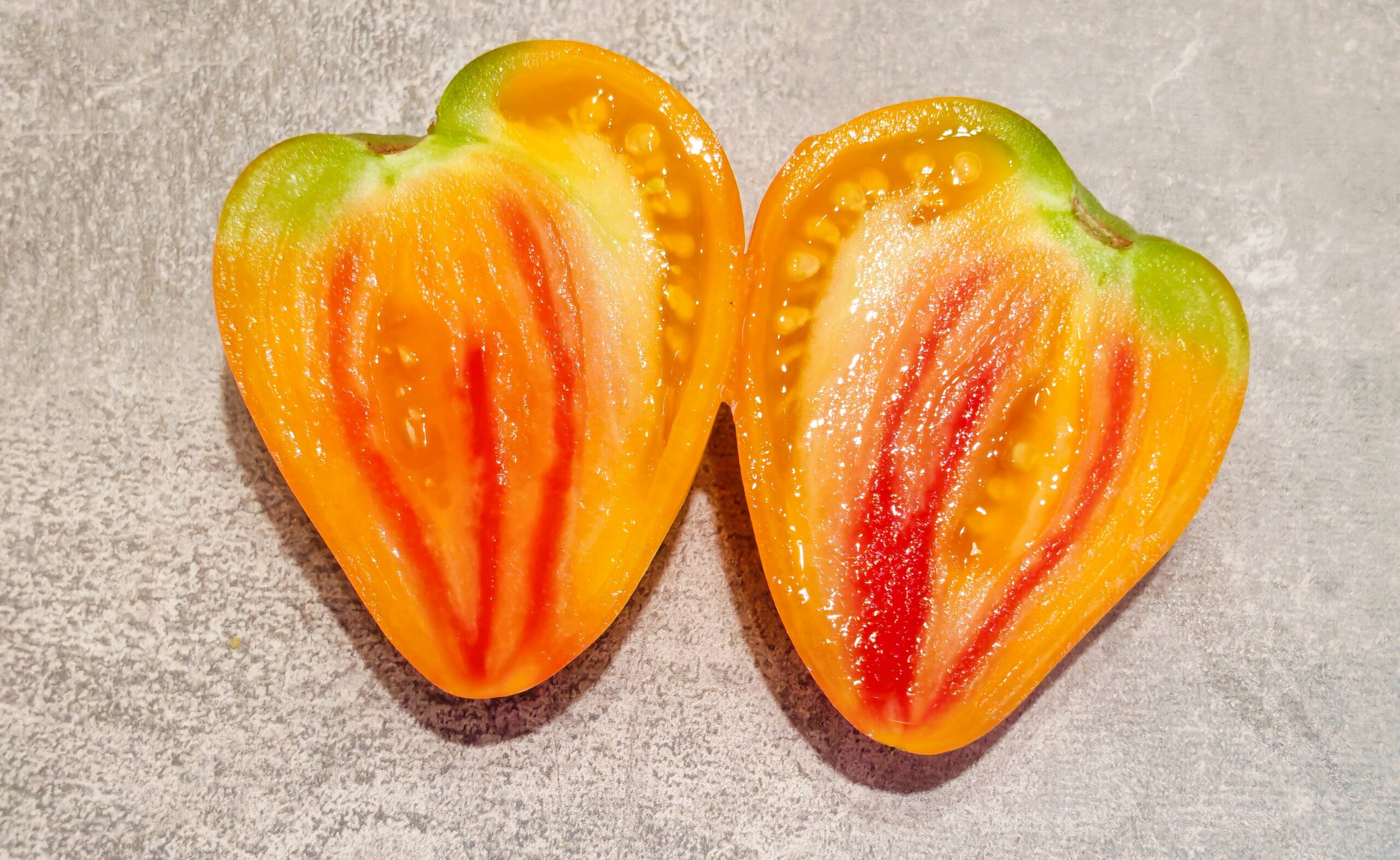 Kolor/ Kształt: Owoce w kształcie serca, przypominające truskawki, o bardzo słodkim, dwukolorowym miąższu. Jedna z linii krzyżówki Sergeant Pepper + Pineapple Heart + Strawberry Schlaumbach.