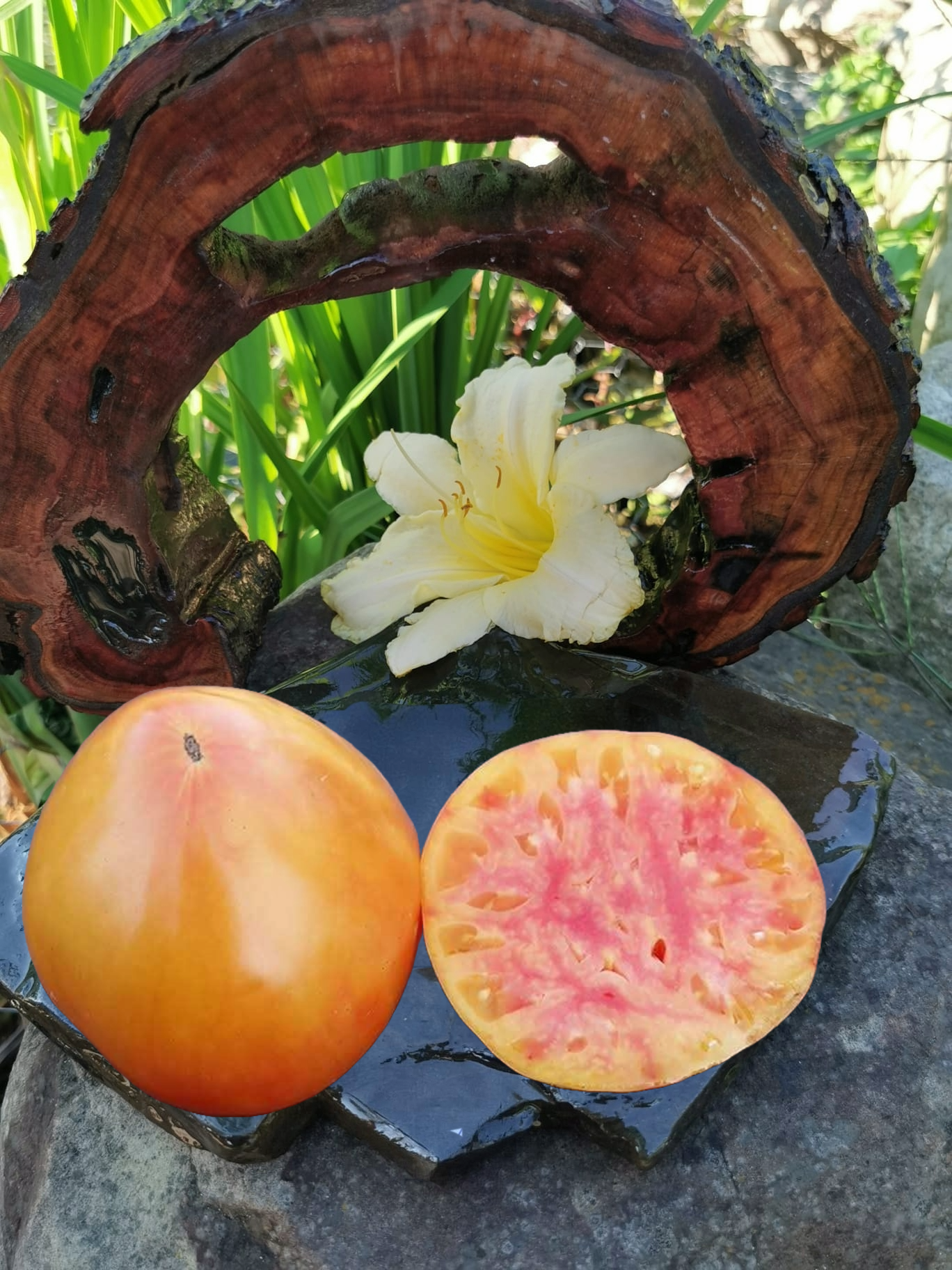 Kolor/ Kształt: Czerwono-pomarańczowy pomidor o cienkiej skórce, bardzo mięsistym zwartym, prawie pozbawionym nasion miąższu, o wspaniałym intensywnym pomidorowo-owocowym smaku i aromacie.