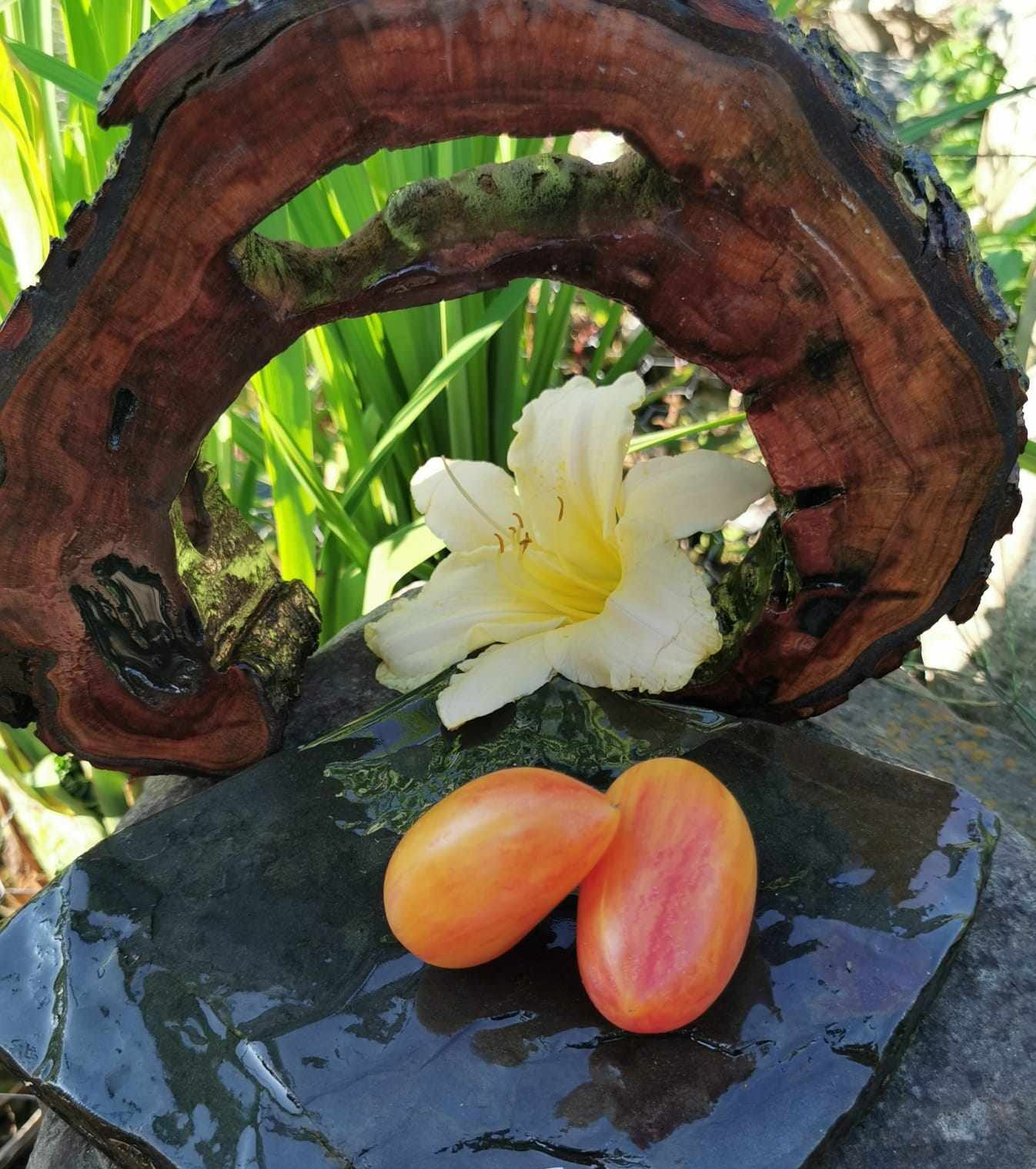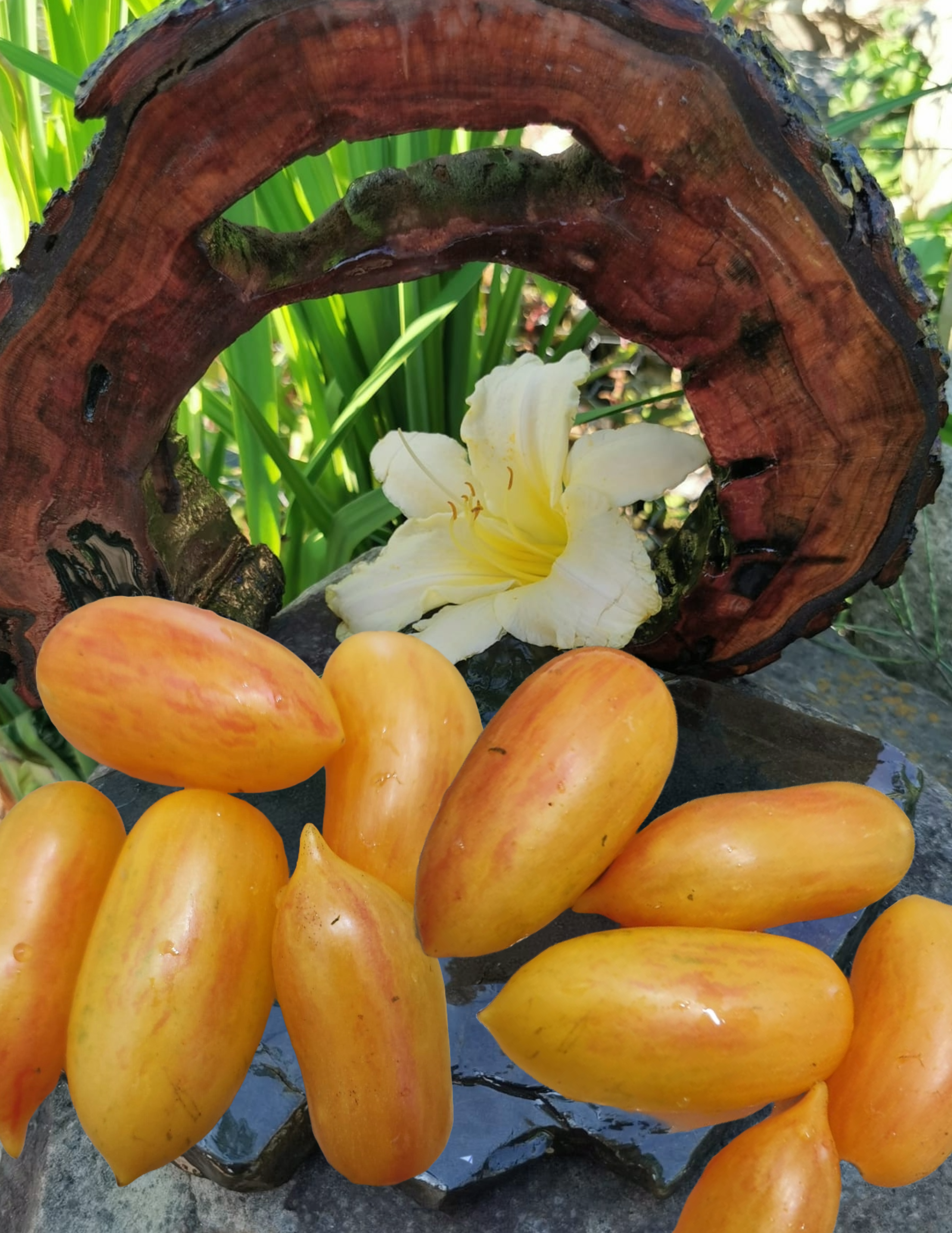 Kolor/ Kształt: Wydłużony kształt owoców, który trudno porównać do jakichkolwiek innych pomidorów. Do tego przepiękna, wielokolorowa skórka, pokryta wyraźnymi czerwono-żółtymi płomieniami. Pomidor śliwkowy znany ze swojego wyjątkowo słodkiego, soczystego, tropikalnego smaku i ciężkiego zestawu owoców przez dłuższy czas. Owoce są gotowe do zbioru, gdy na złocistożółtej skórce pojawi się różowy rumieniec.