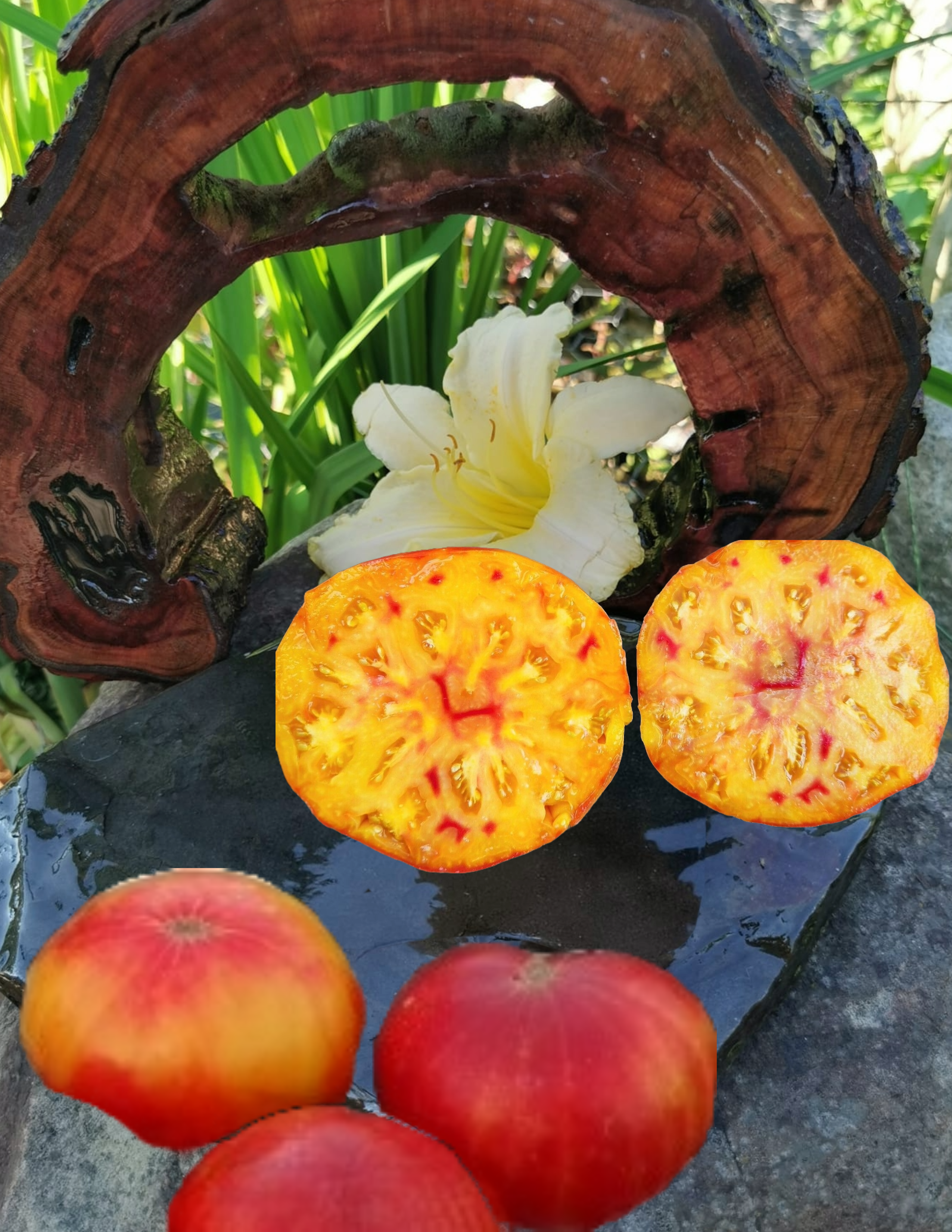 Kolor/ Kształt: Duże dwukolorowe owoce w stylu steka wołowego w kolorze czerwonym/różowym i żółtym/pomarańczowym.