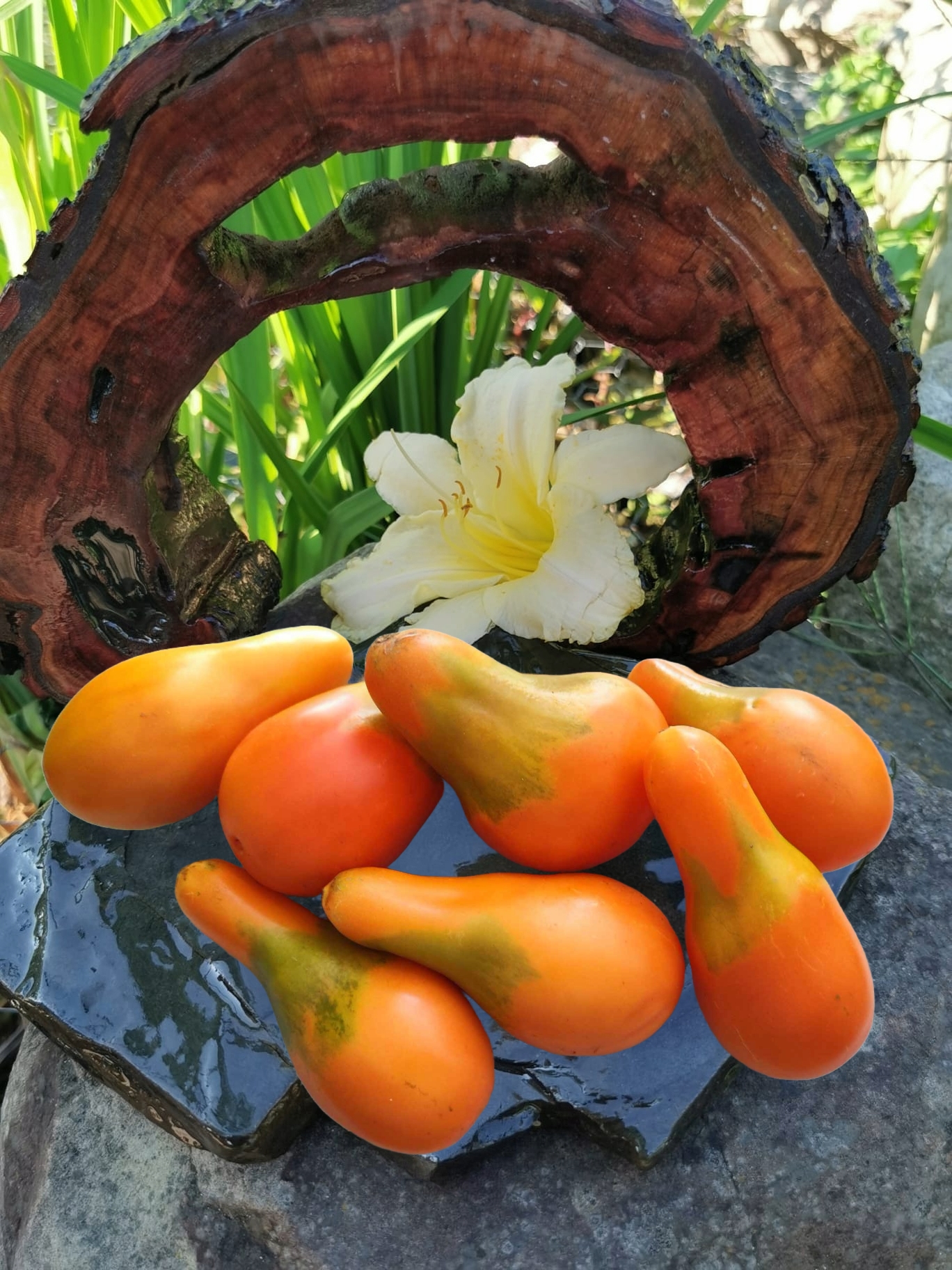 Kolor/ Kształt: Owoce wydłużone, gruszkowate pomidory o barwie mandarynkowo-pomarańczowej, z niewielką liczbą nasion, które wyrastają na długich gronach.