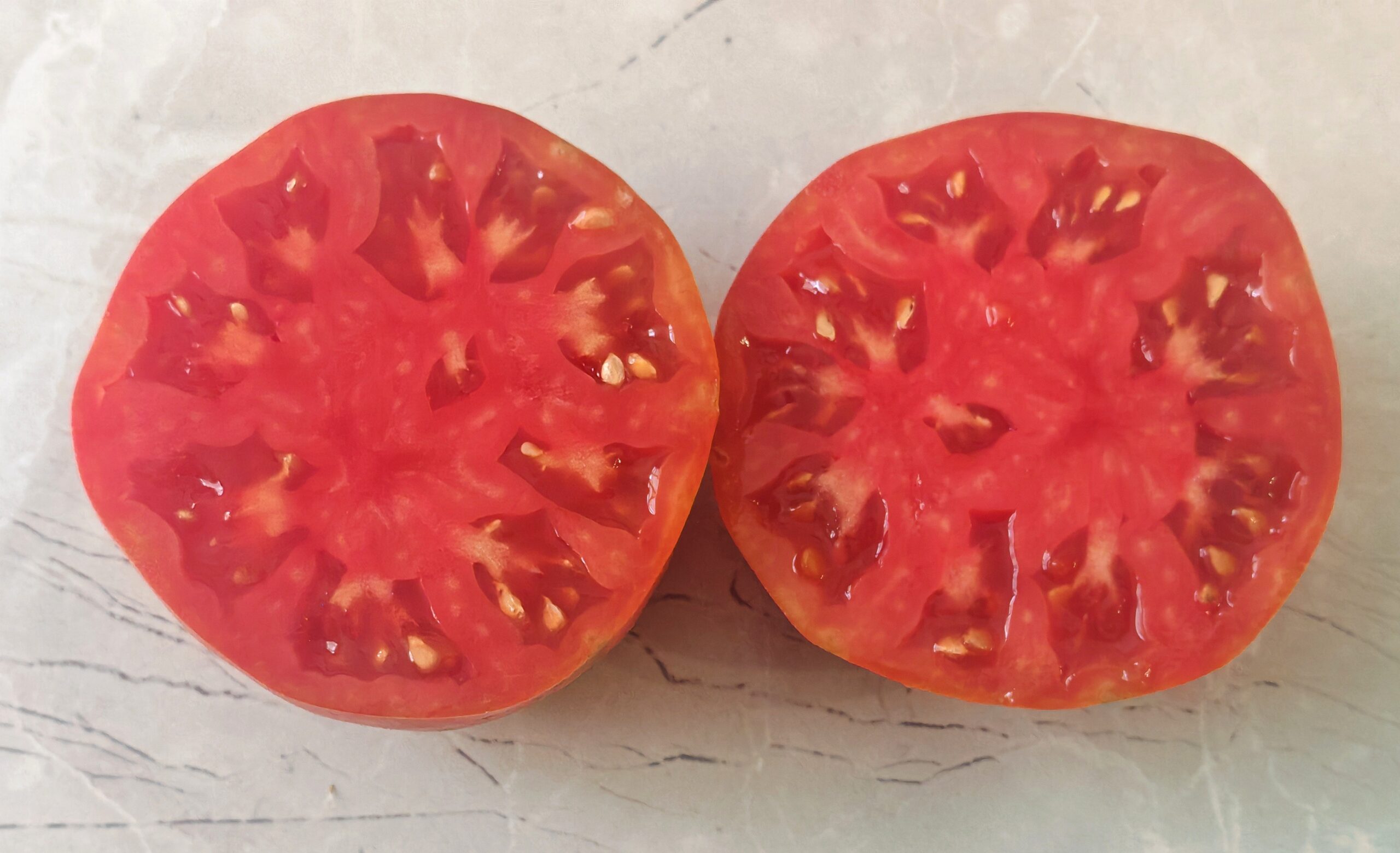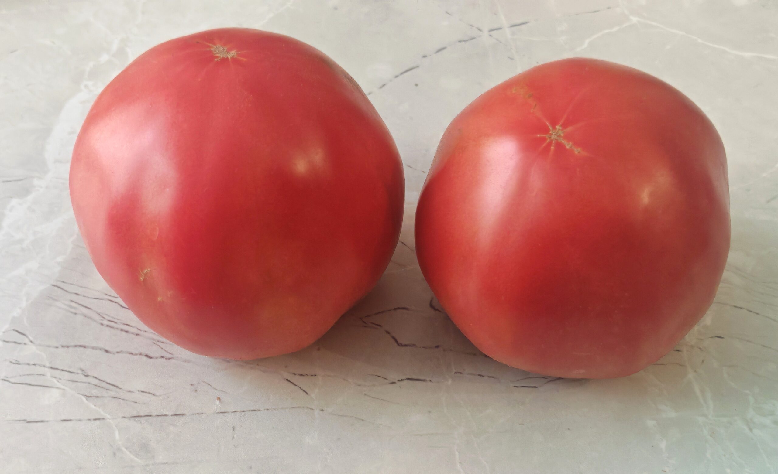 Kolor/ Kształt: Owoce bardzo duże, ciemnoróżowe, spłaszczone, okrągłe, z nabrzmiałymi i żebrowanymi ramionami, które czasami pozostają zielone nawet po osiągnięciu pełnej dojrzałości. Wyraźne wgłębienie przy szypułce. Bogaty smak pomidorów, nie opierający się na słodyczy, lecz na charakterze.
