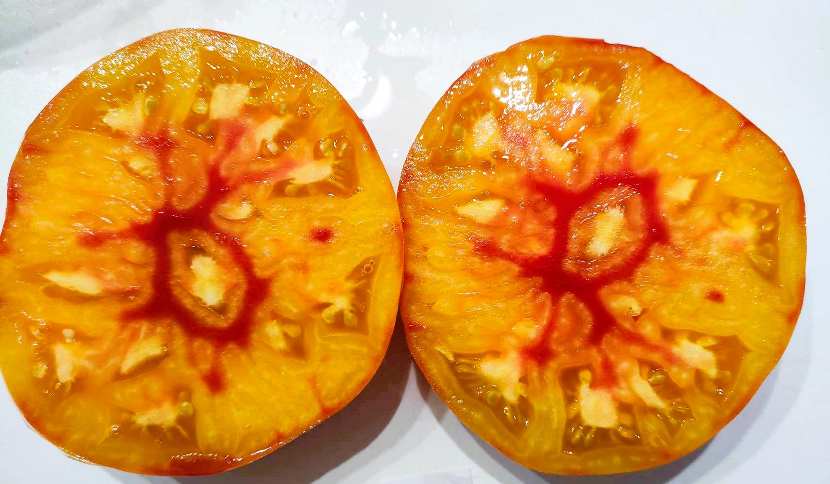 Kolor/ Kształt: Owoce ciemnożółte, pomarańczowo w stylu steka wołowego z czerwonymi paskami są oszałamiająco piękne. Pełne bogatego, super słodkiego smaku z odpowiednią ilością kwasu.
