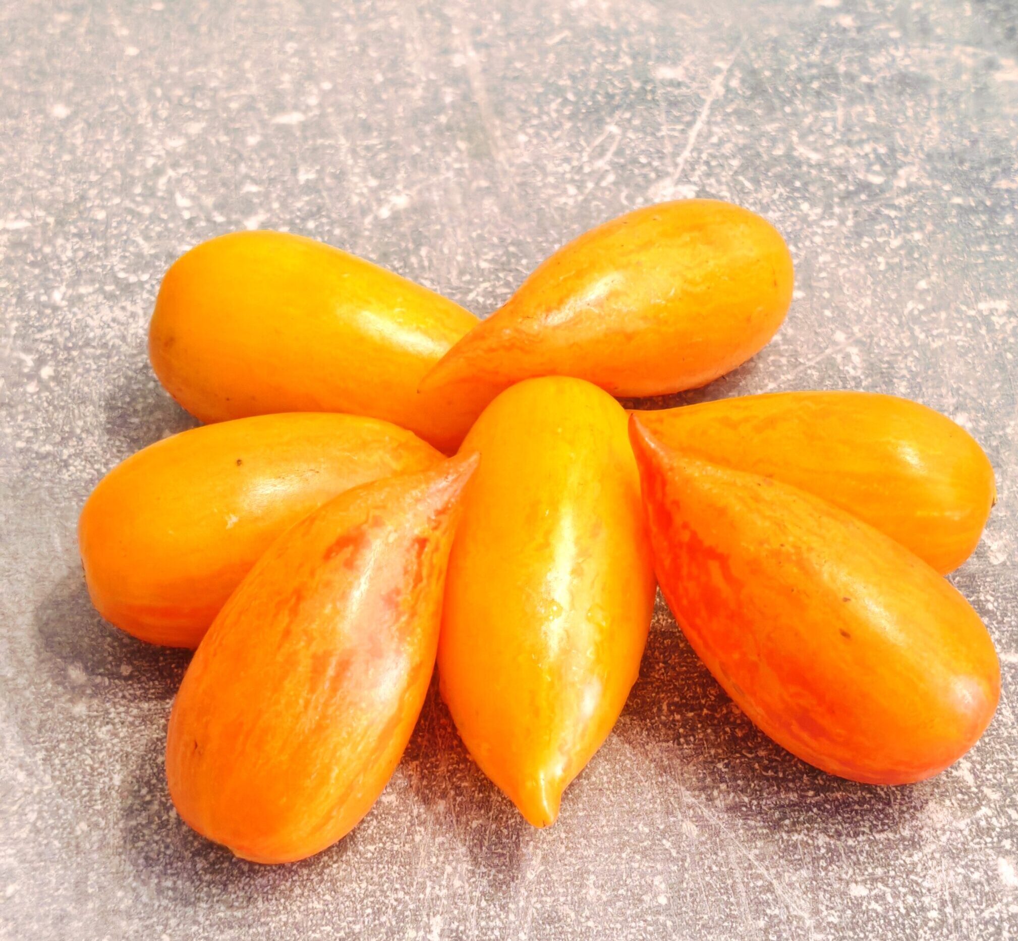 Kolor/ Kształt: Owoce małe, wydłużone, zakończone szpiczasto, jasnożółte, prążkowane, w kolorze złocistożółtym. Miąższ o konsystencji pasty, w pełni dojrzały, nakrapiany czerwonymi plamkami. Łagodny, słodki i owocowy smak.