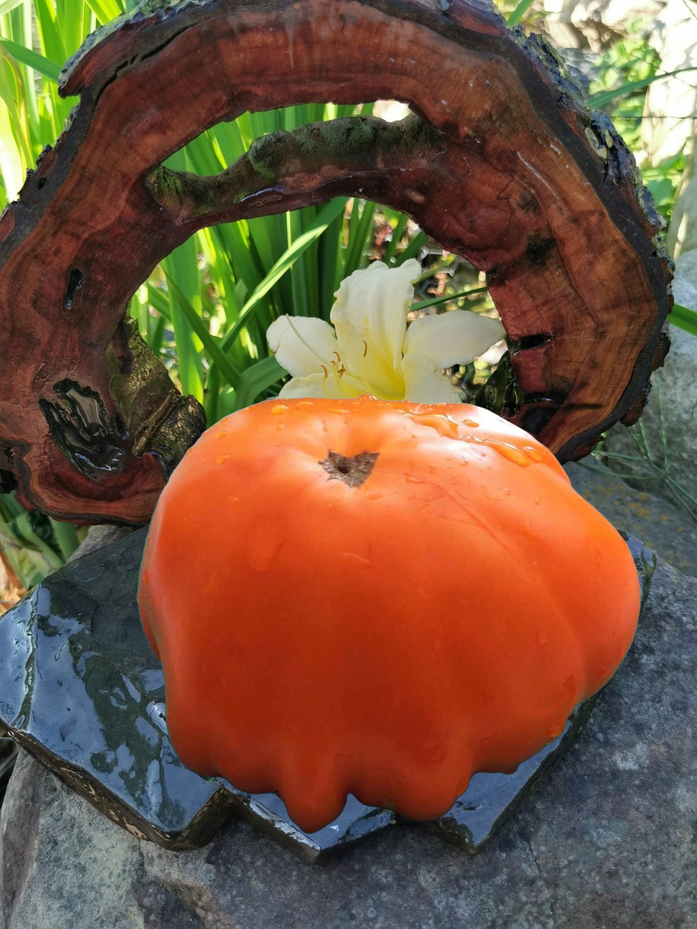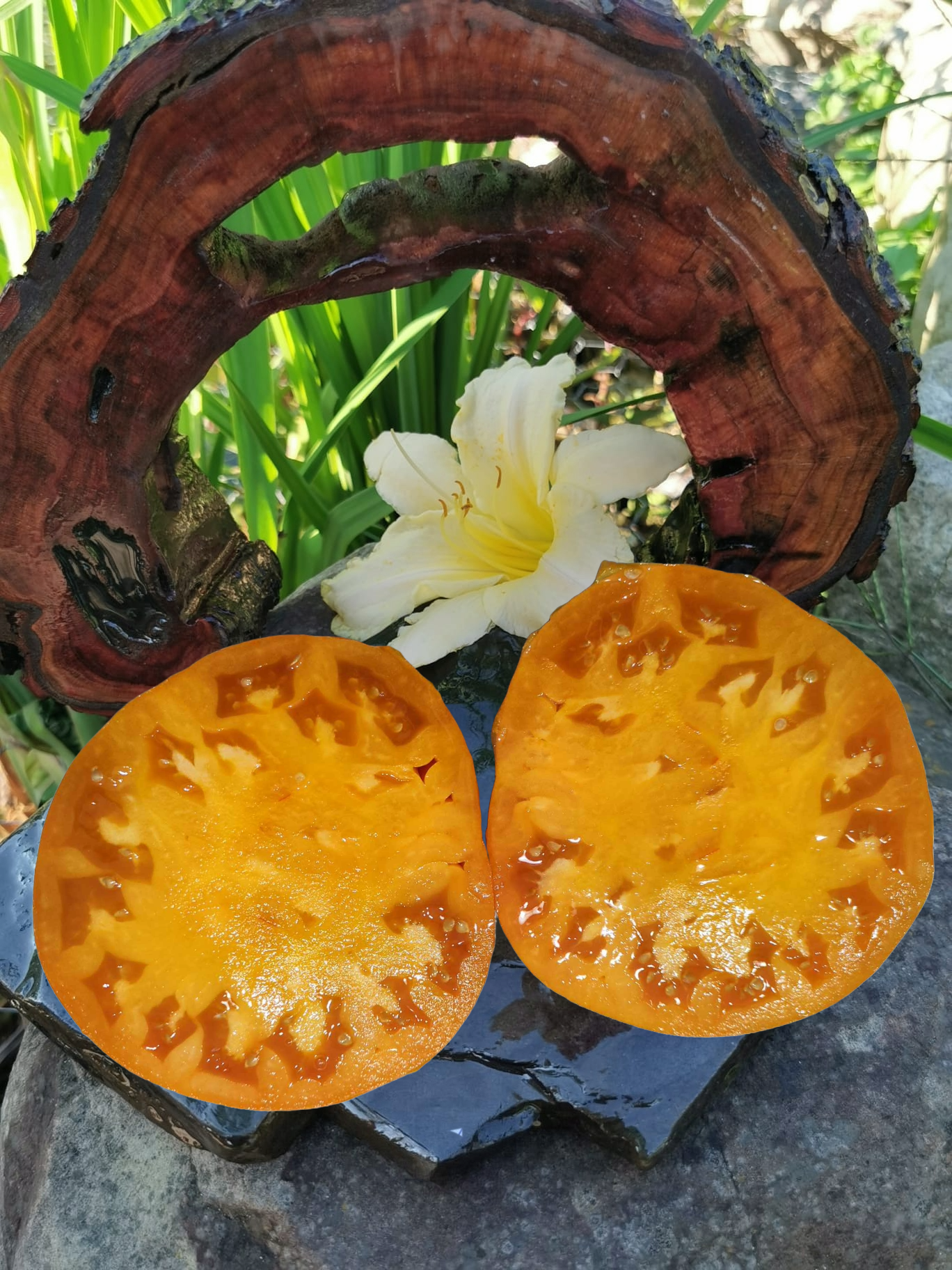 Kolor/ Kształt: Złocistożółte owoce ze złotym miąższem. Słodkie, soczyste owoce o owocowym smaku pomidora. Owoce lekko żebrowane, wołowe.