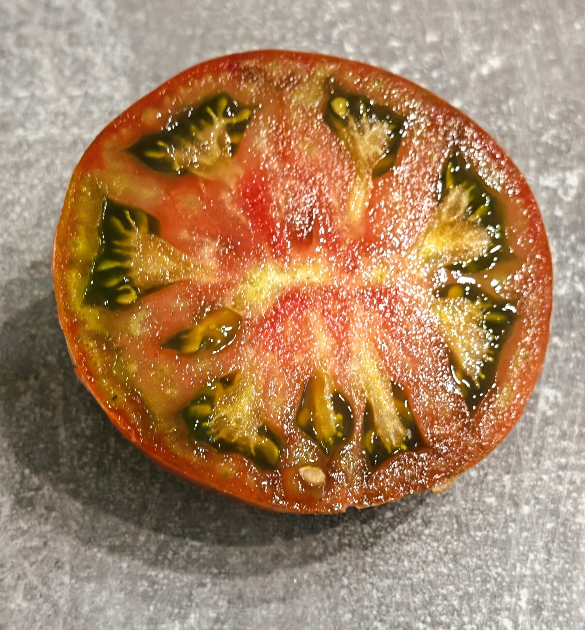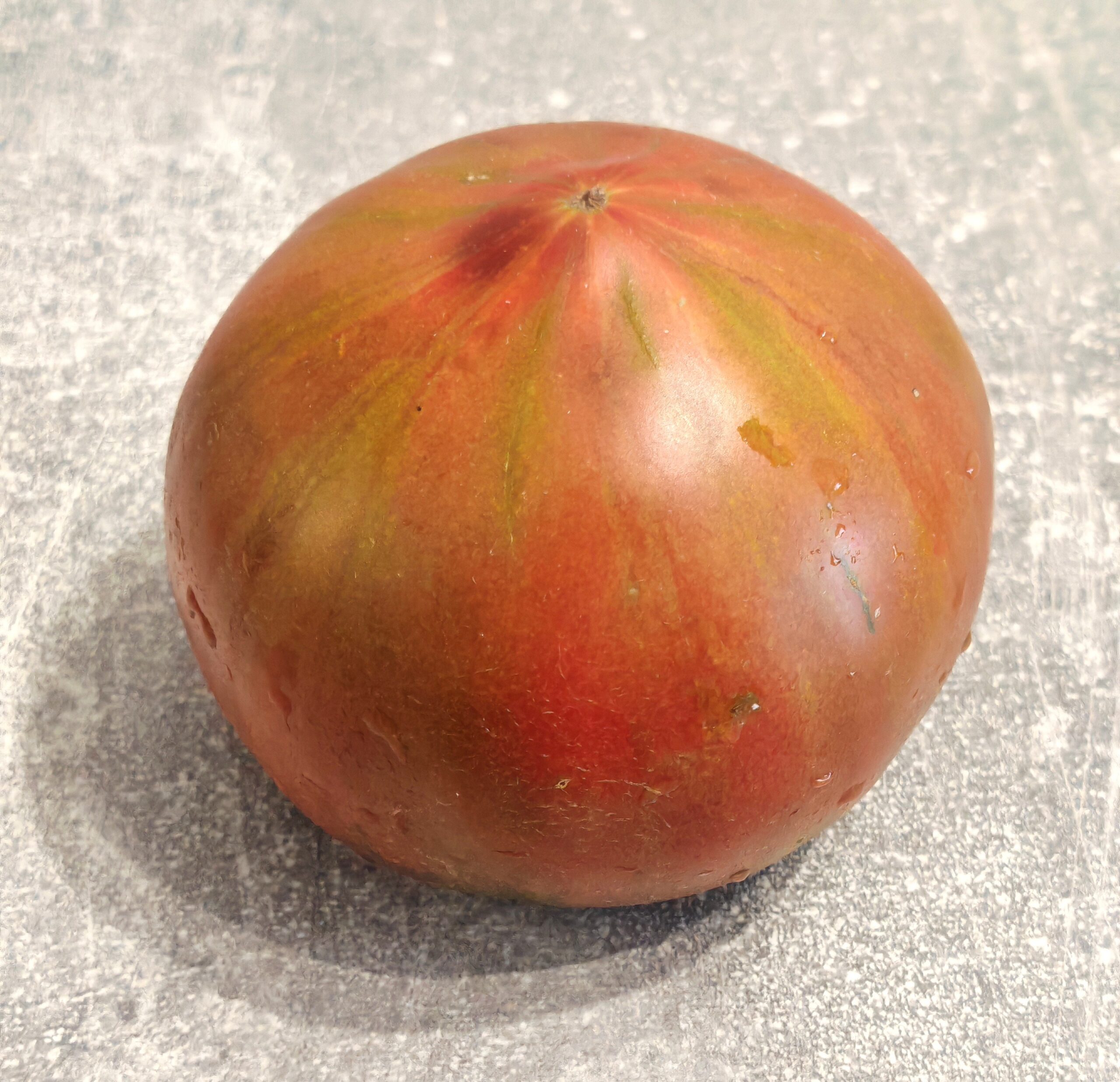 Kolor/ Kształt: Owoce duże, bardzo ładne – oliwkowo-różowe z bordowym wierzchołkiem, po pełnym dojrzeniu stają się prawie bordowe. Miąższ po przekrojeniu jest oleisty, żółty, z malinowymi smugami. Miąższ marmurkowy, z pociągnięciami i odcieniami zieleni i czerwieni. Mięsisty, tłusty, oleisty, o jasnym, wieloaspektowym smaku. Bardzo smaczny pomidor.