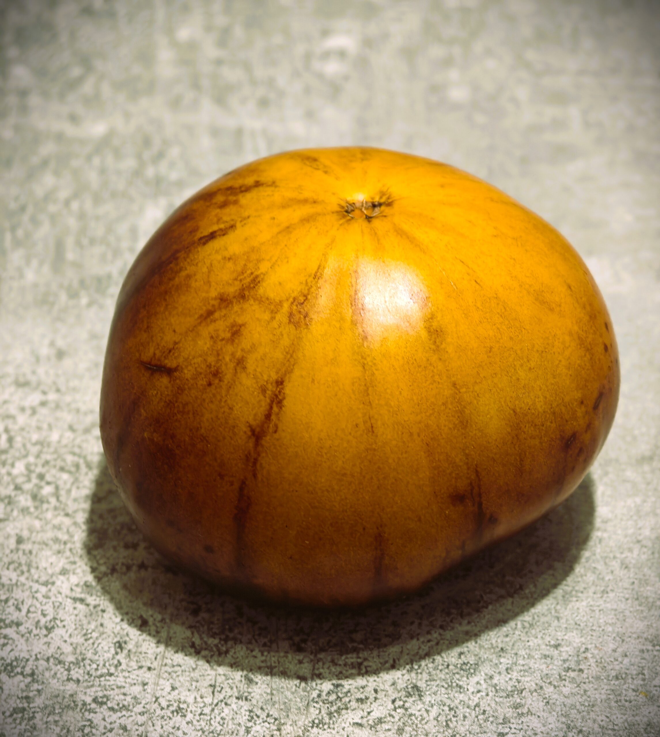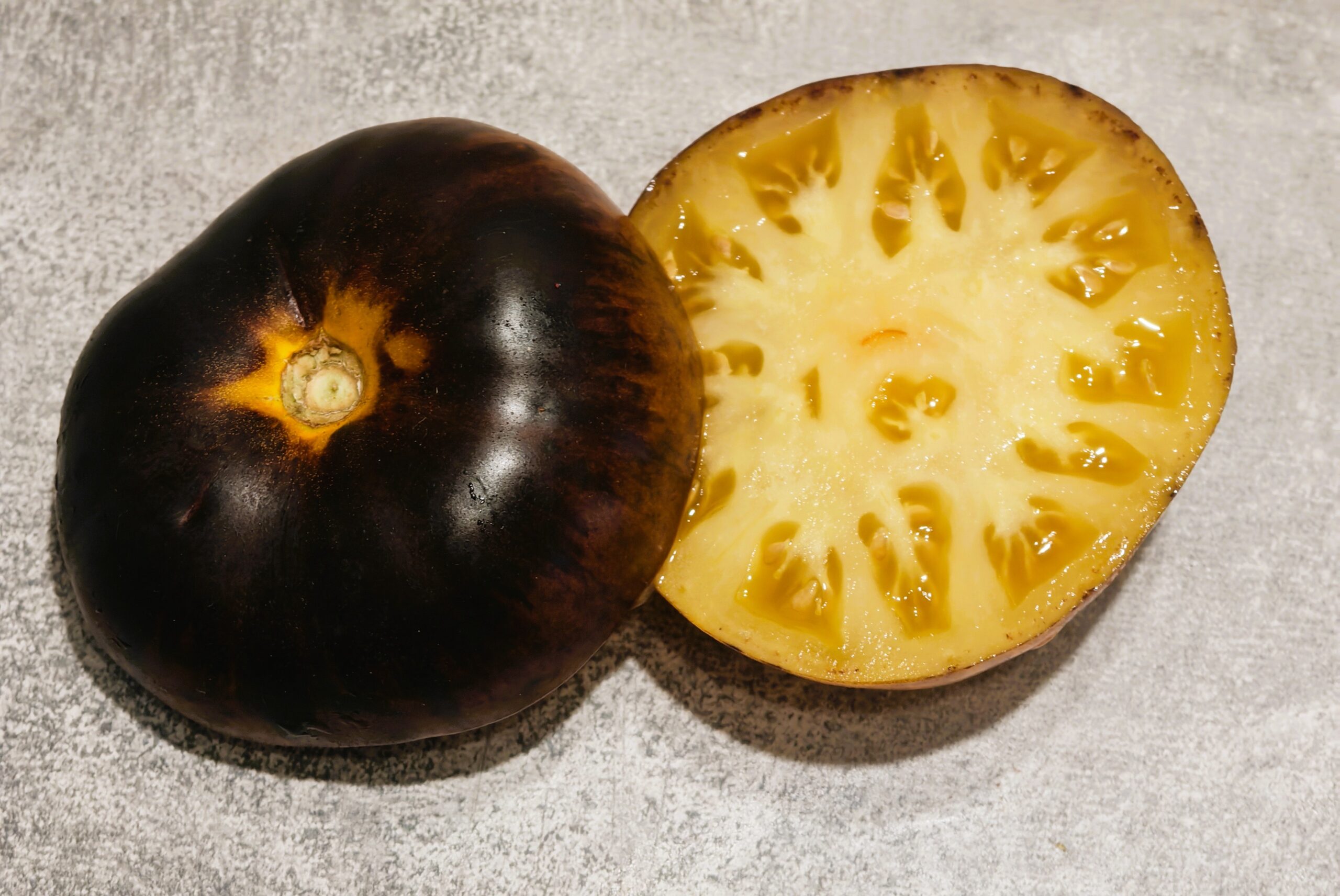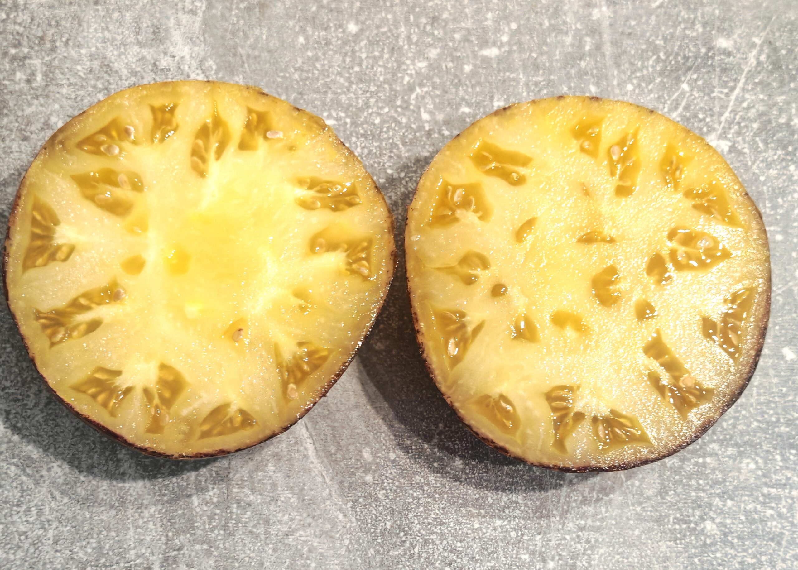 Kolor/ Kształt: Owoce typu steka wołowego, spłaszczone na końcach, lekko żebrowane na górze i o mniej lub bardziej zaokrąglonych barkach. Żółty prążkowany indygo-niebieskim kolorem w pionie, mniej lub bardziej regularnie owoc. Całkowicie czarne ramiona. Soczysty, mięsisty żółty miąższ. Łagodny smak.
