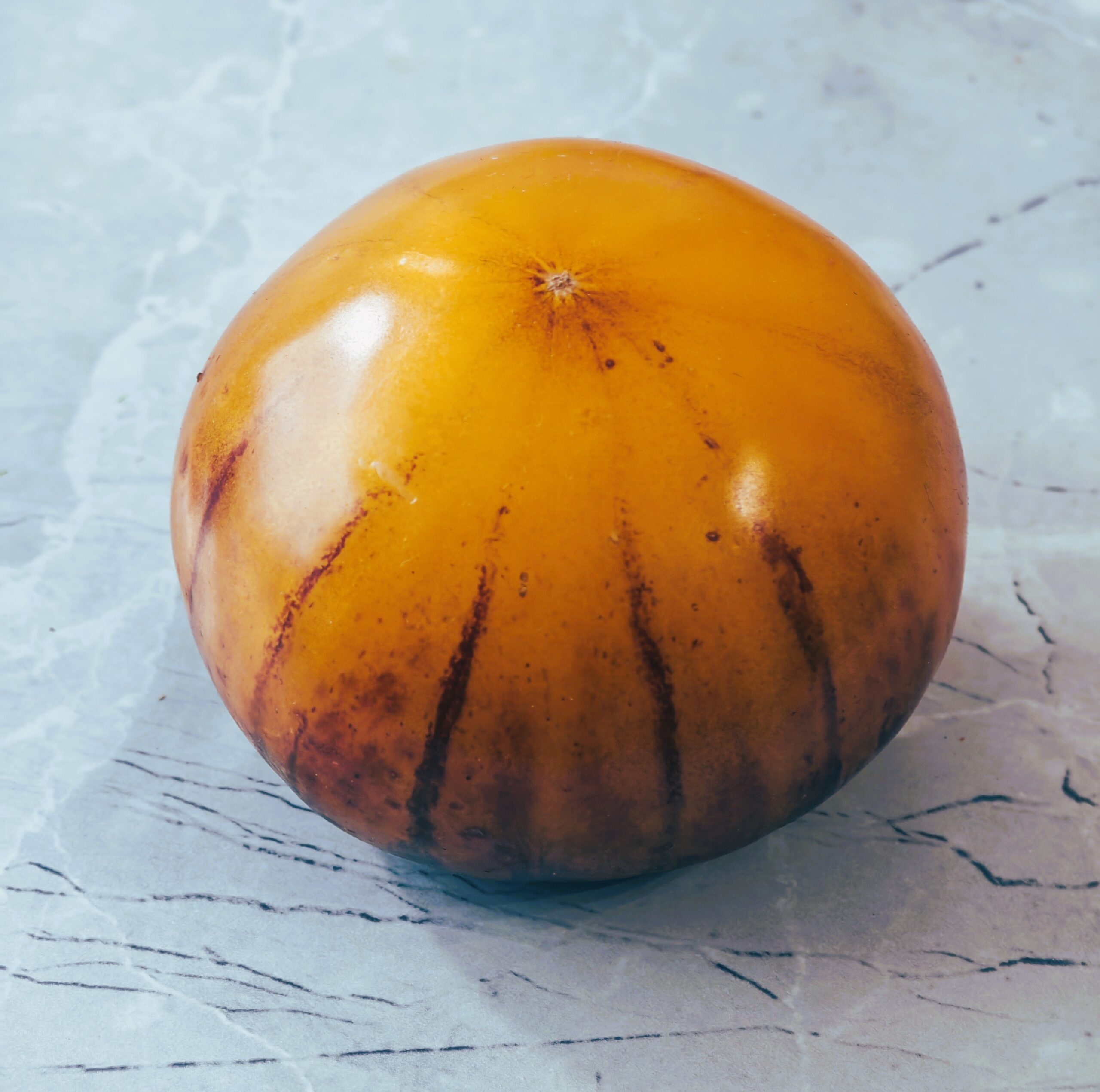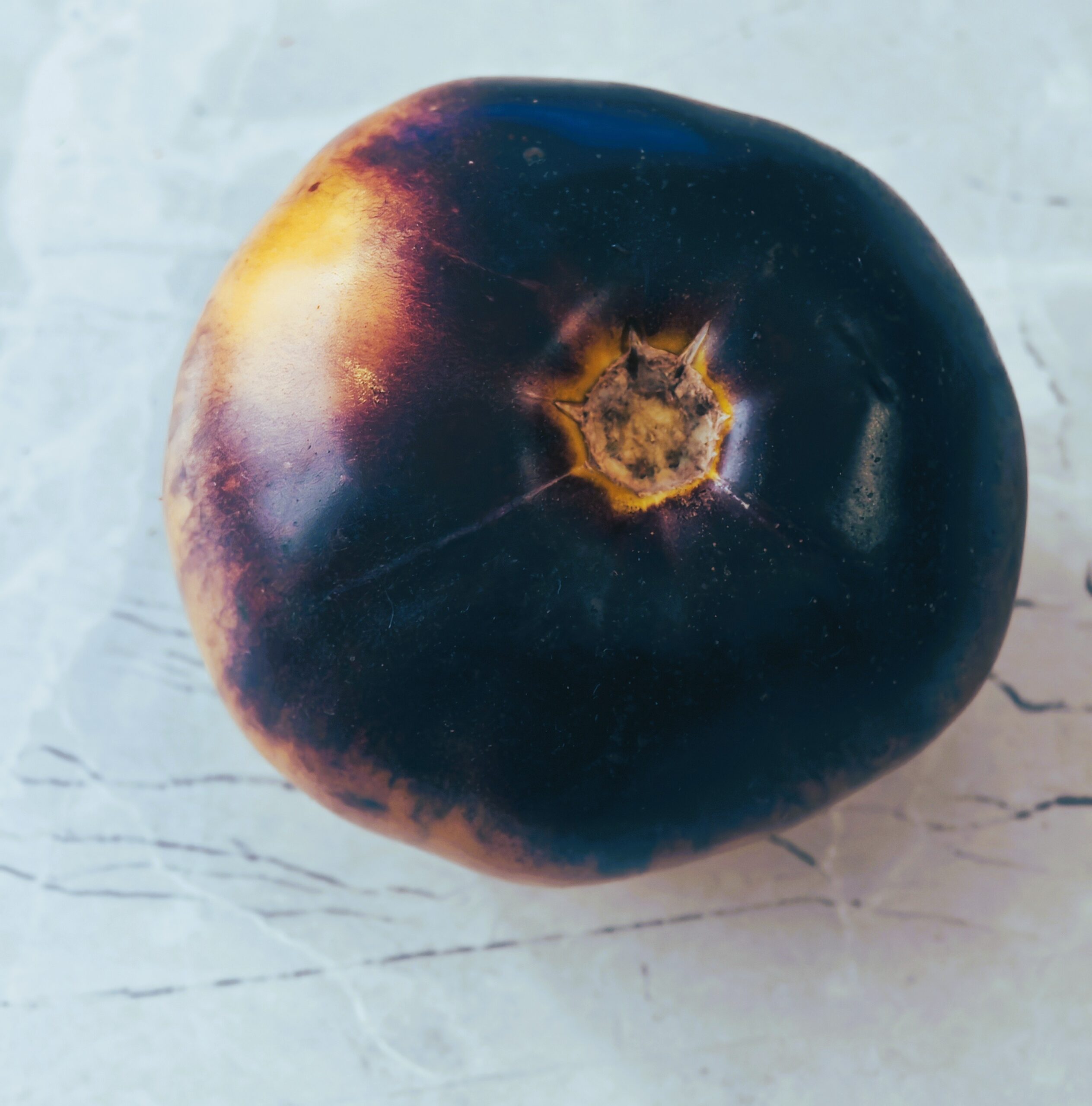 Kolor/ Kształt: Owoce są typu wołowego, spłaszczone. Pomidory są żółte, nakrapiane indygo-niebieskim kolorem. Miąższ mięsisty i soczysty.
